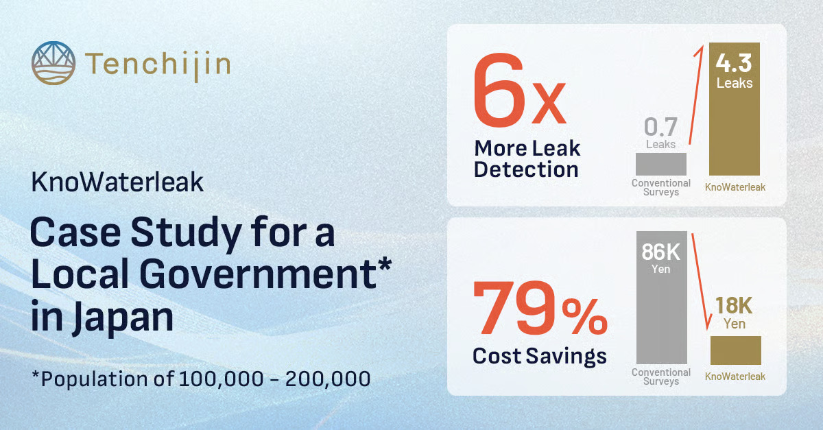 Tokyo, Japan – June 12, 2025 – Tenchijin Inc., a space-tech innovator, announces the implementation of its “KnoWaterleak” solution in a Japanese local government. This digital transformation (DX) solution for water utilities leverages satellite dataleverages satellite data to support sustainable water infrastructure management and has significantly improved both leak detection efficiency and cost-effectiveness. In municipalities with populations between 100,000 and 200,000, the solution achieved 6 times higher efficiency in leak detection and a 79% reduction in leakage survey costs.