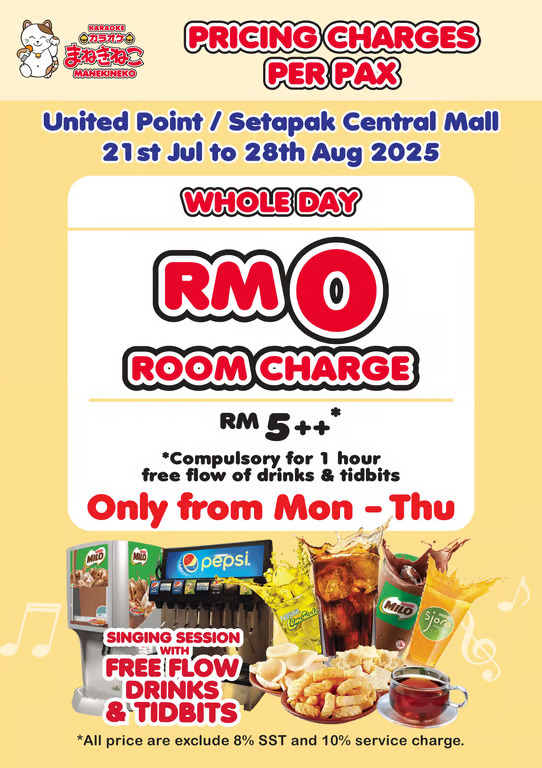 Karaoke Manekineko is turning up the volume on fun with an exciting weekday promo! For a limited time only—from Monday to Thursday, customers at United Point and Setapak Central Mall can enjoy RM0 room charges for the whole day.