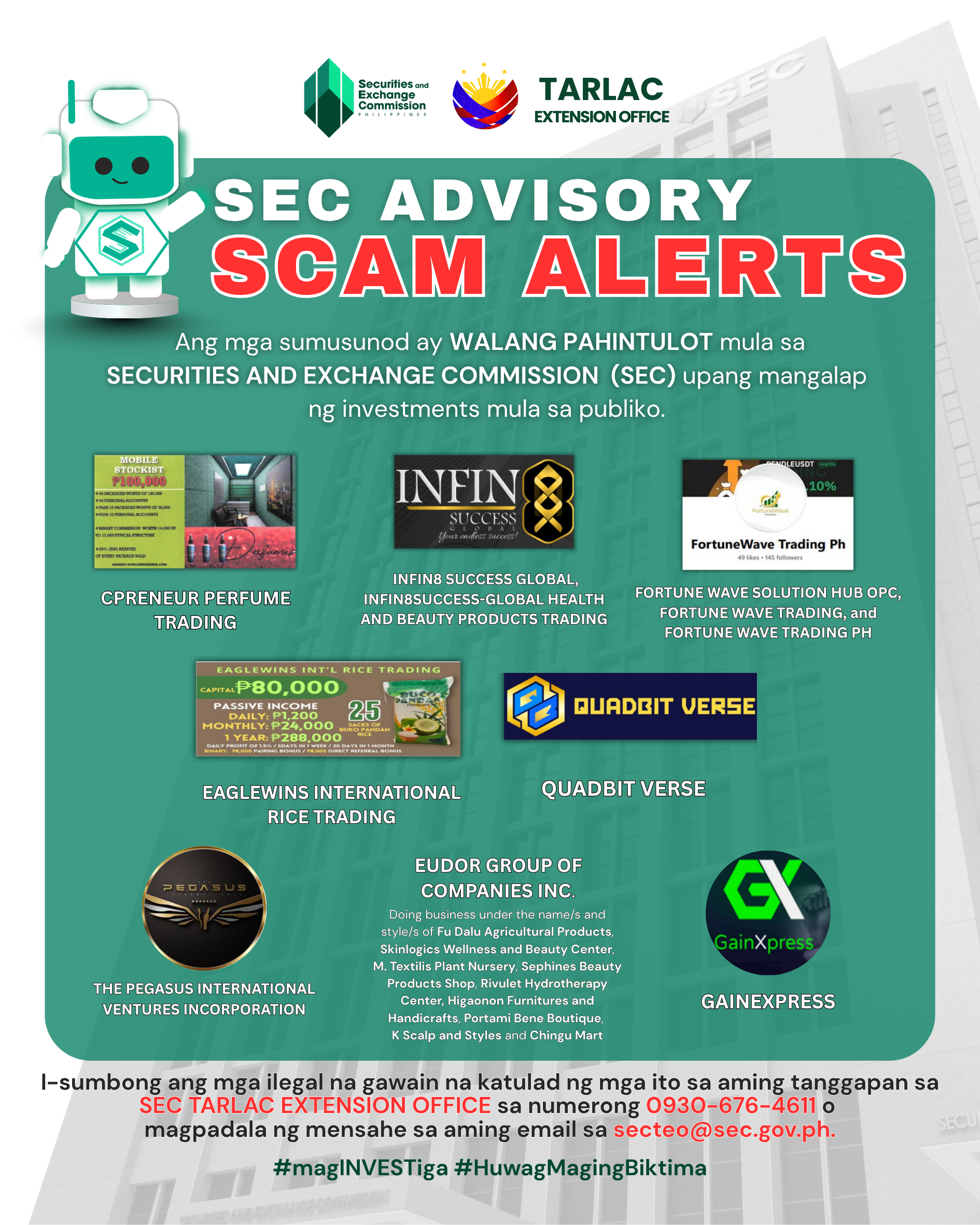 NOTICE TO THE PUBLIC: The Securities and Exchange Commission (SEC) warns the public against individuals and groups soliciting investments without the necessary license. These entities have been found to